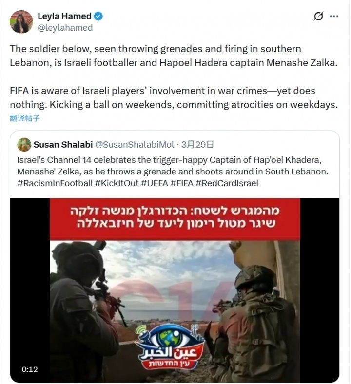 对于扎尔卡的这种行为,记者Leyla Hamed很是愤怒,他不满国际足联竟然能对这样的事无动于衷。今日,该记者转发了相关报道,并表示:“这位在黎巴嫩南部扔手榴弹并开枪射击的士兵,是以色列的球员扎尔卡。国际足联完全知道以色列球员参与战争的罪行,却没有任何处罚。”