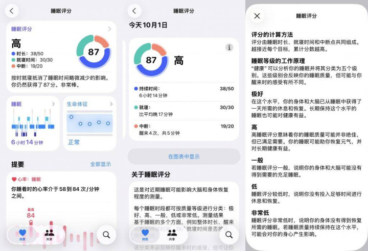 所以苹果是根据什么样的标准为用户的睡眠质量打分?评分系统有三个指标,能看出苹果侧重哪些方面: