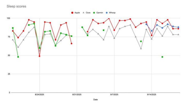 苹果的睡眠评分也以鼓励性质为主,Lifehacker 对比了好几家不同可穿戴设备的睡眠评分,发现 Apple Watch 的给分基本都是最高的。