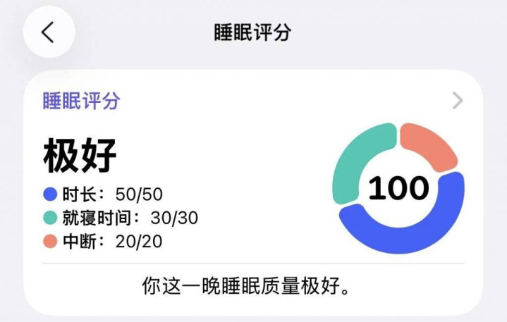 回看苹果给分的标准,不可控的「中断情况」占比最少,另外两项「持续时间」和「就寝时间」更多是用户能靠主观实现的。
