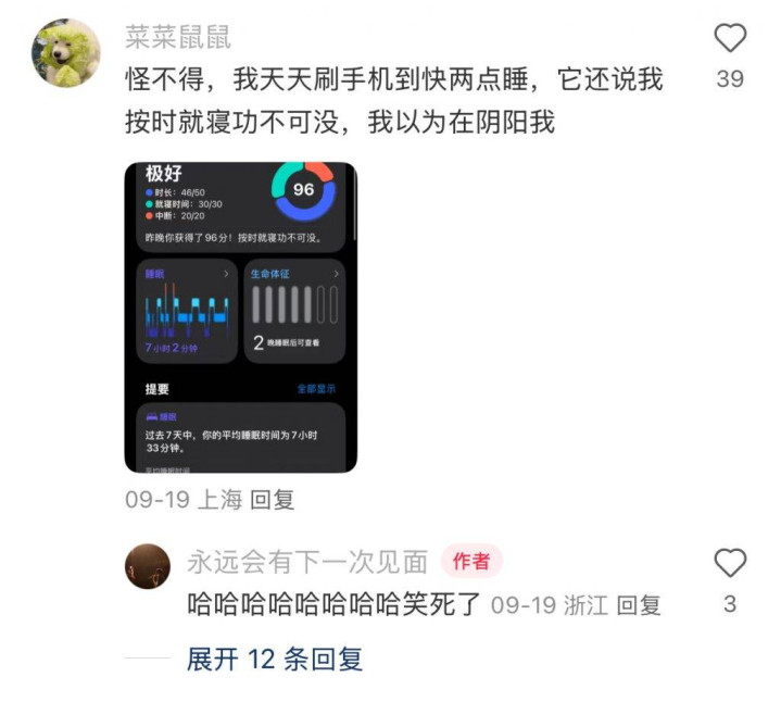有的人只是单纯分享自己的睡眠状况,有的人炫耀自己的「满分睡眠」,还有一些二三十分的截图,能收获不少网友的震惊。