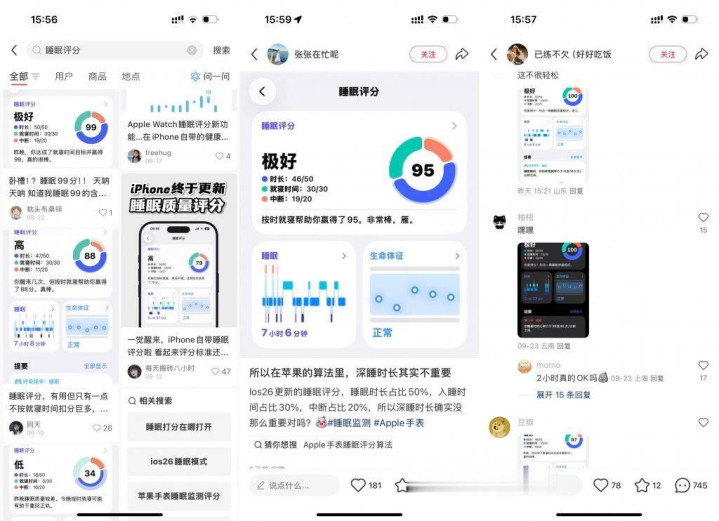 于是在小红书上,我们能看到不少非常类似的帖子:首图是一张睡眠评分的 iPhone 截图,点进去发现评论区也全被大家晒的睡眠评分截图淹没: