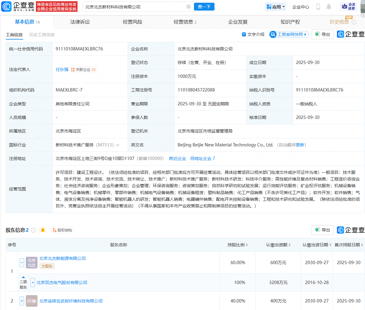 北京北杰新材料科技有限公司成立,法定代表人为任东强,注册资本为1000万元,经营范围包含:新材料技术研发;环保咨询服务;智能机器人的研发;智能机器人销售;电器辅件销售等。企查查股权穿透显示线上配资之家,该公司由双杰电气(300444)全资子公司北京北杰新能源有限公司、北京连续玄武岩纤维科技有限公司共同持股。